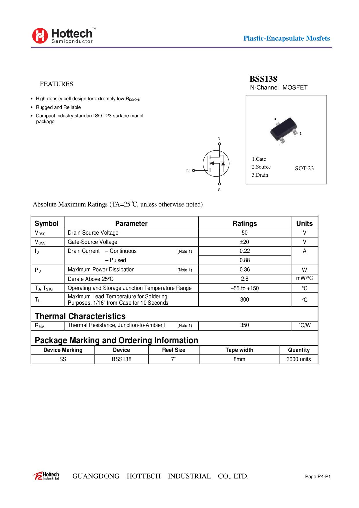 Power MOSFET, 200 mA, 50 V, N−Channel SOT−23